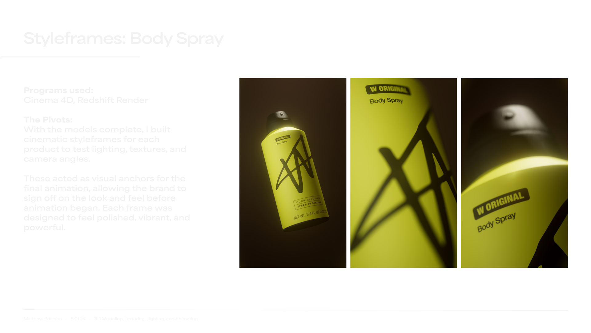 This 3D animation pitch was created to showcase GetW’s body wash, deodorant, and body spray lineup. It blends stylized product shots, a custom 3D city, and athlete footage to reflect the brand’s energy and performance-driven identity. I modeled, textured, and animated this piece in Cinema 4D, Redshift Render, and Adobe After Effects.