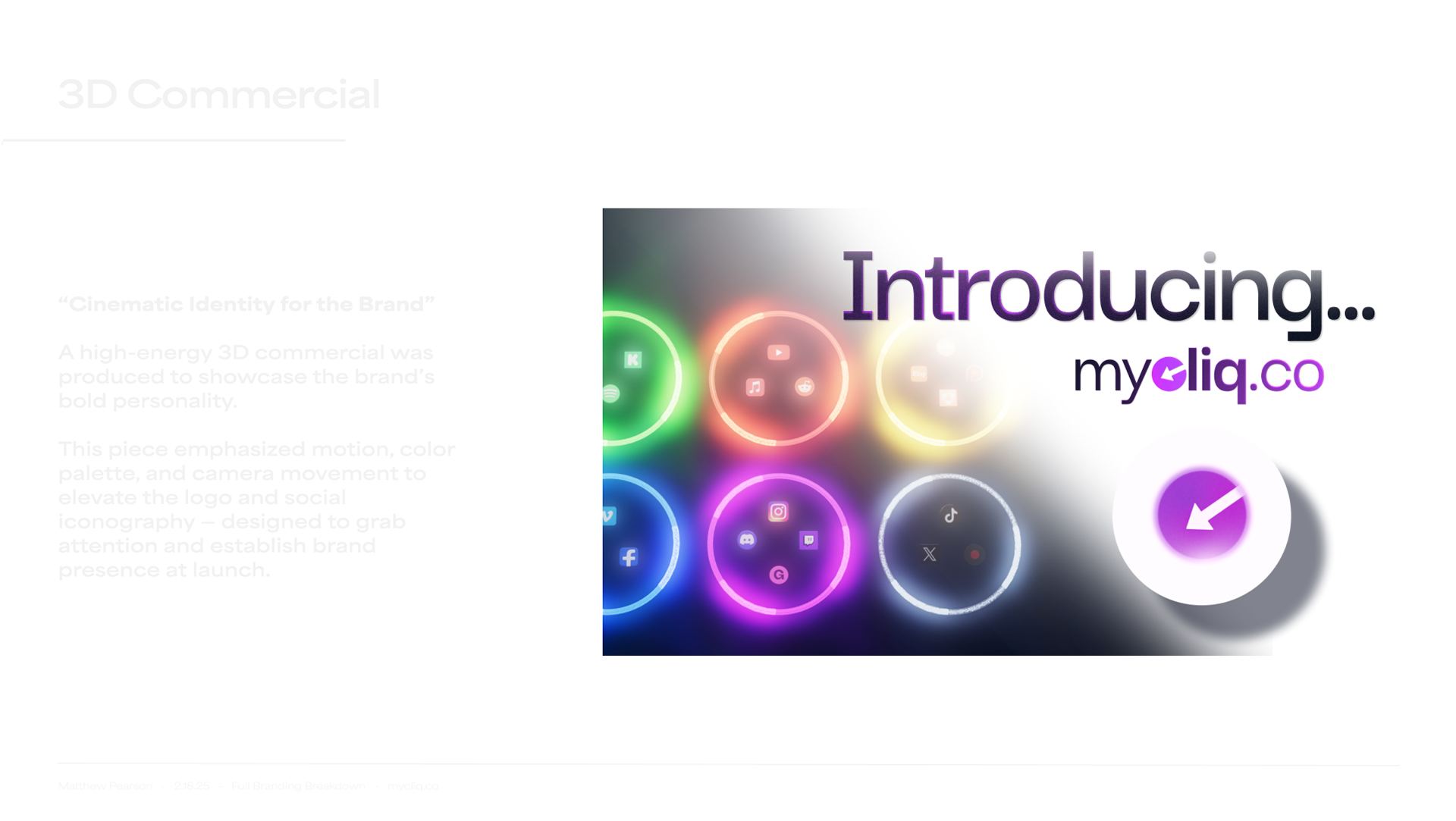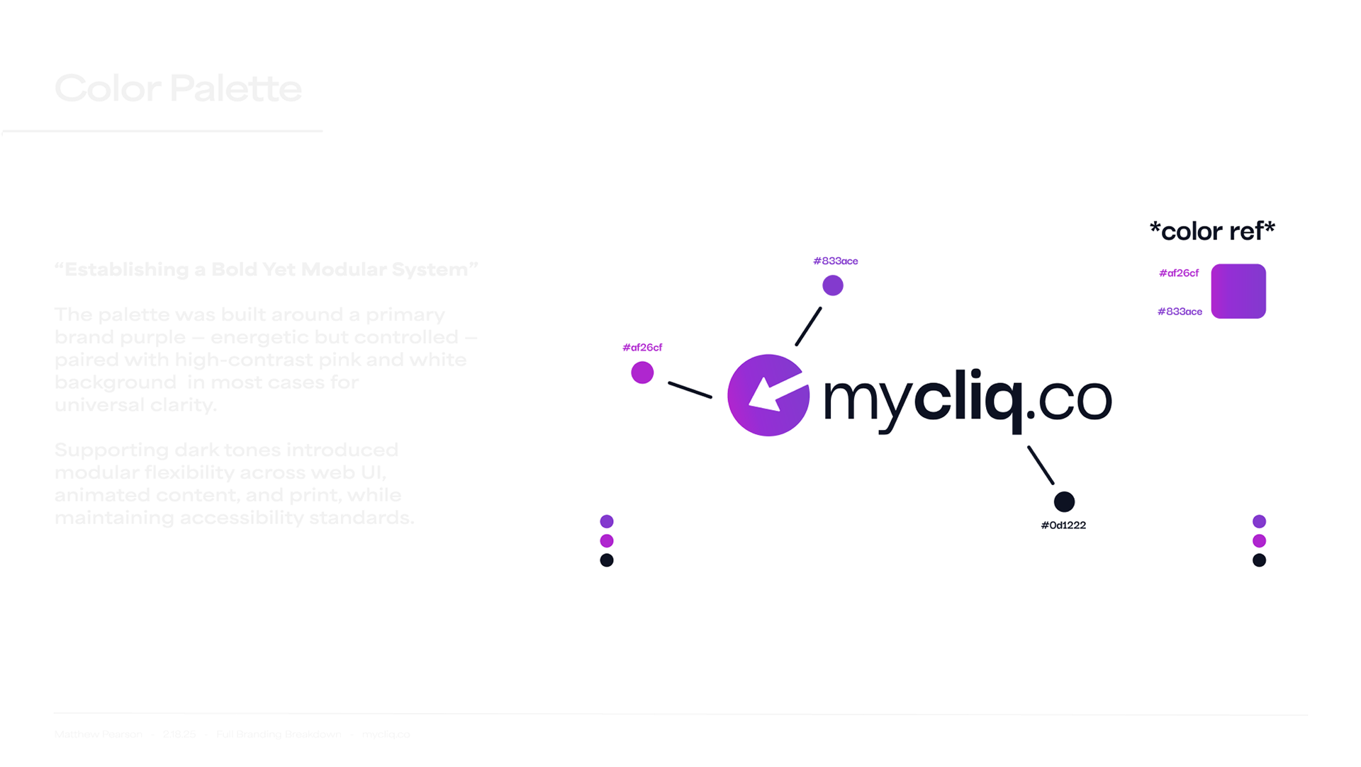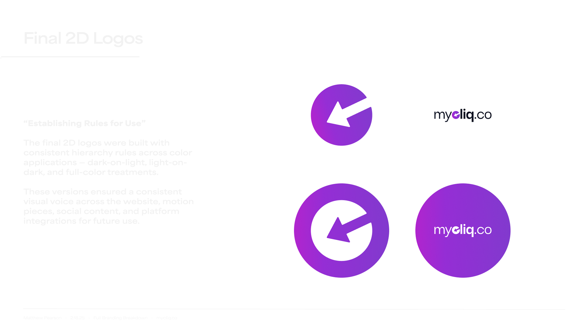 MyCliq.co is a web-based platform that lets creatives showcase their content, services, and social media through responsive, animated profile pages. I designed the entire branding package — everything from logo design to motion systems.
