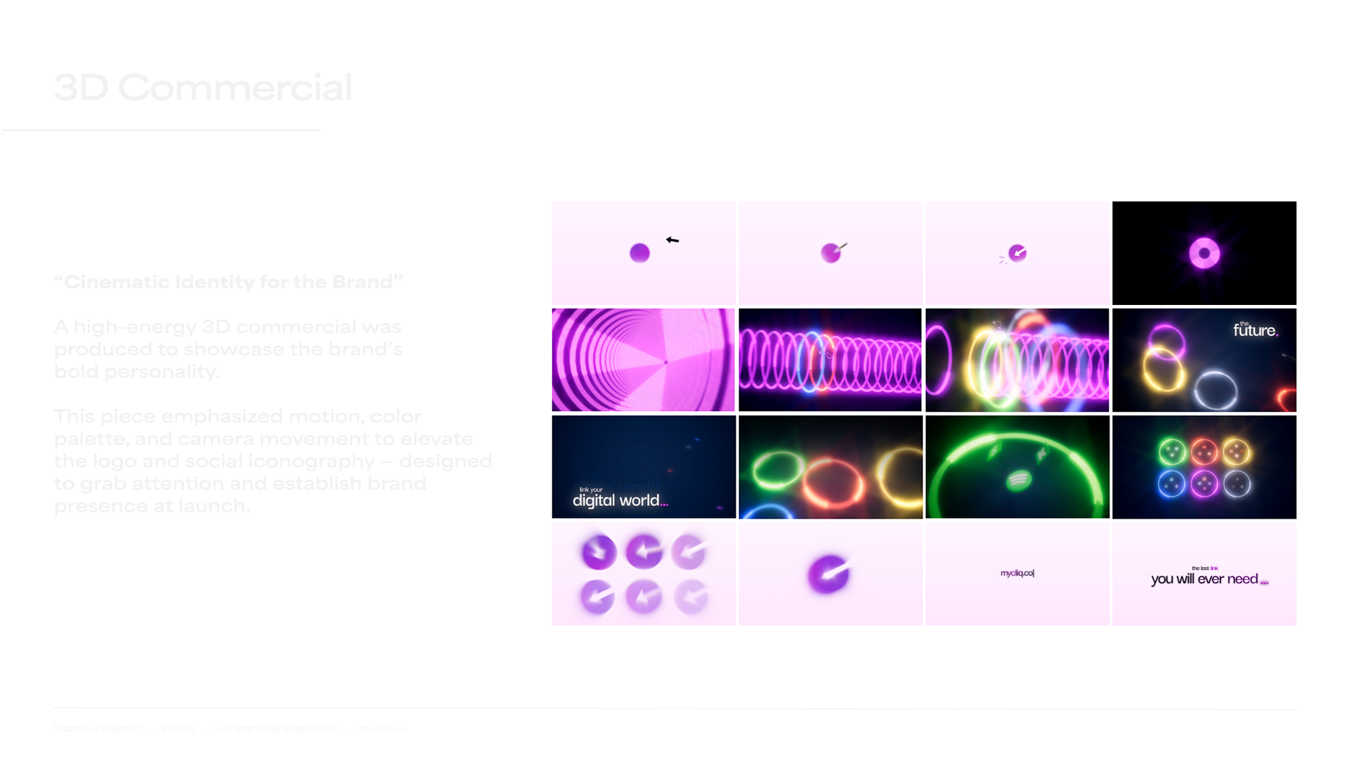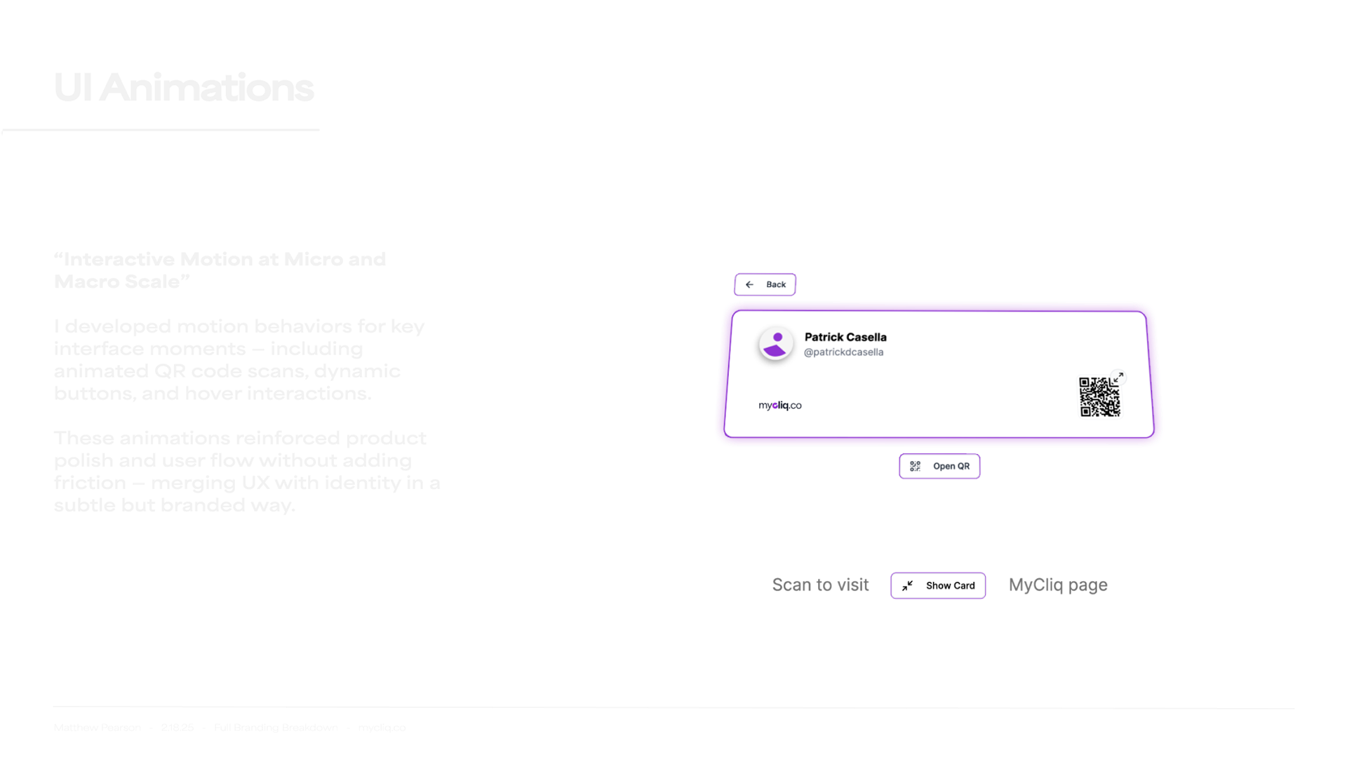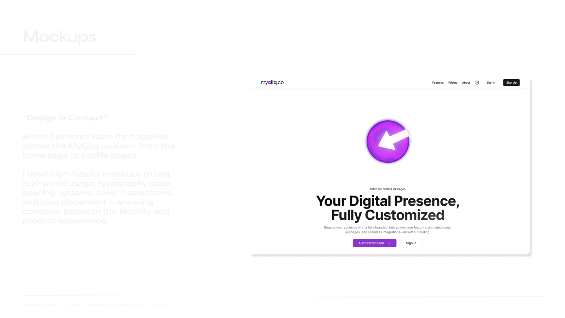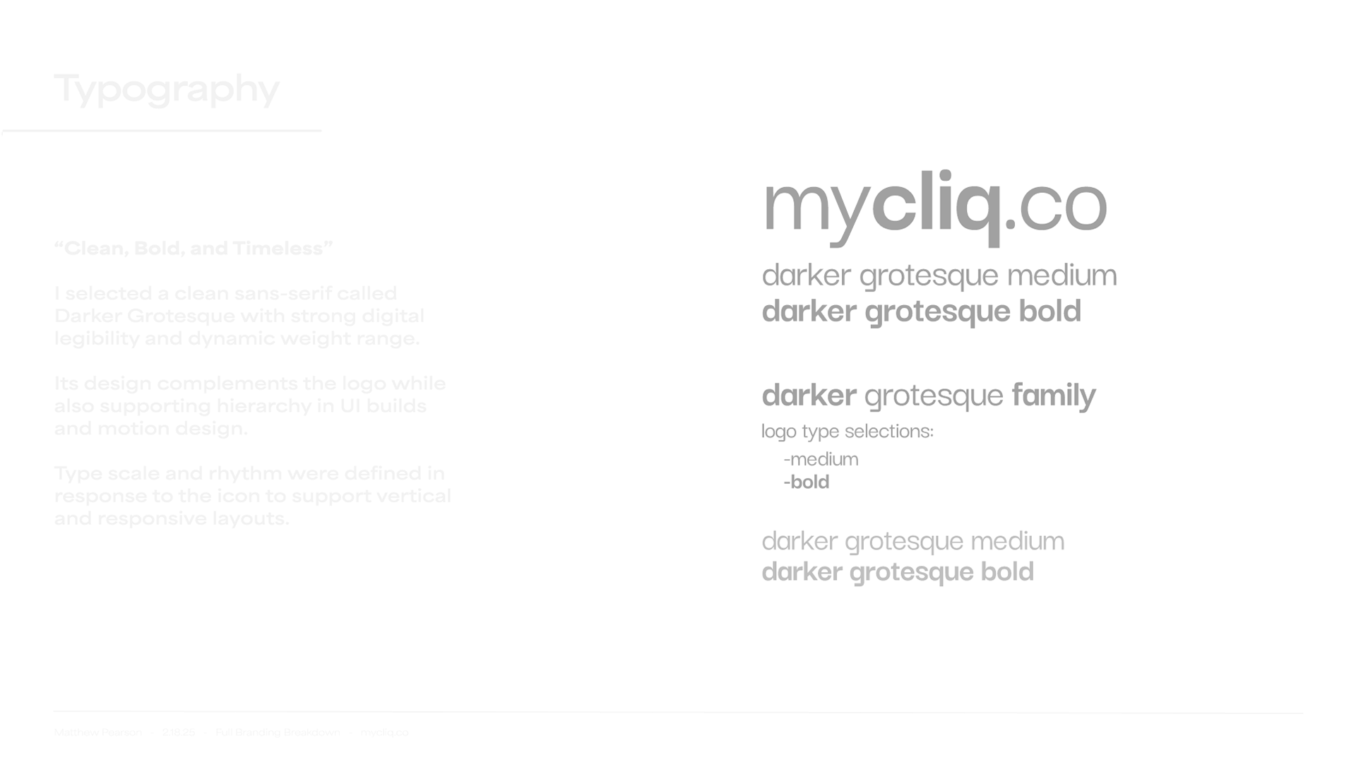 MyCliq.co is a web-based platform that lets creatives showcase their content, services, and social media through responsive, animated profile pages. I designed the entire branding package — everything from logo design to motion systems.
