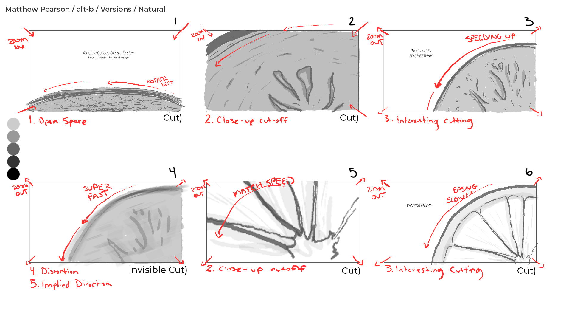 This project was a title sequence using sliced fruit made to look massive in macro. The story would be a versions archetype with lots of graphic match cuts.